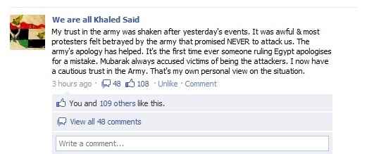 The moderator of the “We Are All Khaled Said” Facebook page is pointing out that in apologizing the army is breaking with decades of political tradition and forging a new tradition in which the government apologizes to people which entails a recognition that it has obligations to those people.