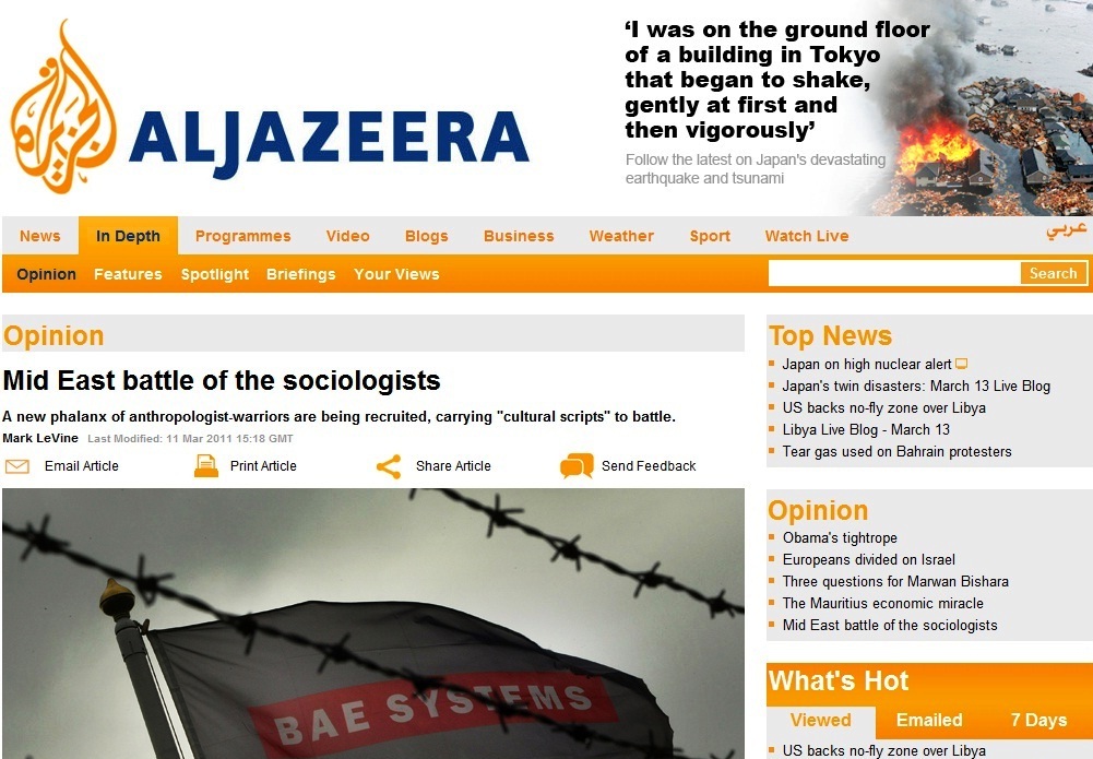 Al-Jazeera English is the latest media outlet to run an article on Human Terrain Systems (HTS) claiming “A new phalanx of anthropologist-warriors are being recruited, carrying ‘cultural scripts’ to battle”. Written by historian Mark LeVine, the article describes a brochure he received asking him to send job-hungry social scientists this way.