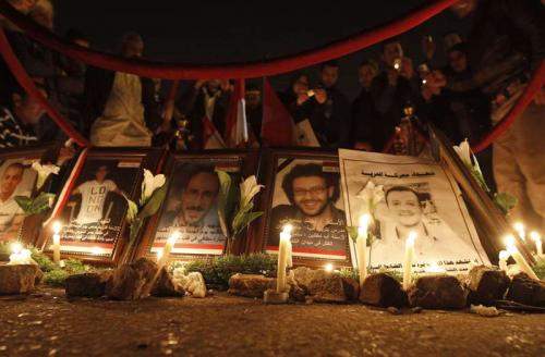 Pictures of Egyptian anti-government protesters killed during clashes with police and pro-government forces are displayed during a candlelight vigil at Cairo’s Tahrir Square on February 9, 2011. This is an AFP phot to which I have absolutely no rights. I will remove it if they ask me.