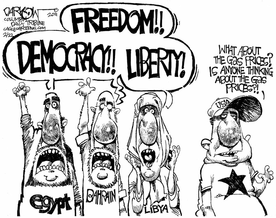 A lot of the comments I hear about Egypt’s uprisings from neighbors and acquaintances are negative. One acquaintance, a blue collar worker, said of Egypt “all I see over there is chaos.” Even those who believe that the uprisings in Egypt and elsewhere represent real efforts at democratizing aren’t happy about it. Either they believe that the Middle East can’t “do” Democracy for various reasons, or they argue that any democracy will be taken over by Islamists, turning these countries into clones of Iran. Still others argue that democracy in the Middle East isn’t in US interests.
