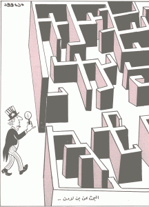 This cartoon from a 2002 issue of the magazine Caricature portrays the US entering a labyrinth as we seek to find Osama bin Ladin