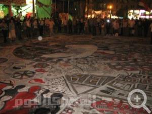 About a dozen artists were hard at work on Wednesday evening, painting a 100-square-meter section of asphalt nearby the KFC at Tahrir Square. From 7:00 to 10:00 that night, a crowd watched closely from just outside the tape-delineated boundaries of the painters’ “canvas”.