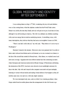 In this bonus chapter, I examine some of the ways Egyptian cosmopolitans rapidly remade themselves in the wake of the Sept. 11 attacks. I argue that these cosmopolitan Egyptians restyled themselves through sets of practices designed either to rebalance their relationship to the West, and especially to the U.S., or to reconfigure the meanings of the indexical signs by which they linked themselves to foreign places, or both. This effort involved not only efforts to rapidly remake self-identities but required rapid reassessments of what Sept. 11 itself meant for those links, and for the global and local worlds they construct.