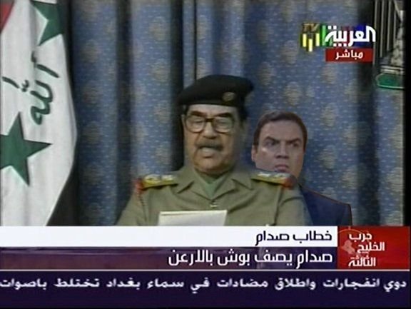 But the joke was in many ways itself a visual joke, and it inspired visual responses. Using photoshop, people began to insert the man behind Omar Suleiman into other photos. Some of the earliest portrayed him as a career-ending angel of death, standing behind Saddam Hussein, Zine El Abidine Ben Ali and Muammar Qadafi.