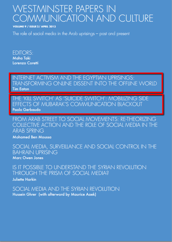 Eaton, Tim. 2013. Internet Activism and the Egyptian Uprisings: Transforming Online Dissent Into the Offline World. Westminster Papers in Communication and Culture 9(2): 3-24.
