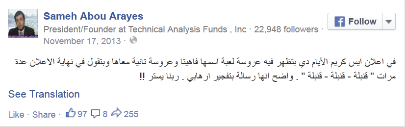 It is hard for me to tell if this is meant to be taken seriously, or if he is just being ironic, given the stupidity of advertising an ice cream as tasting like a “bomb” at a time when bombings are taking peoples lives. But when two bomb attacks occurred in Cairo, and another in the Sinai a few days after his post, Arayes apparently became serious.