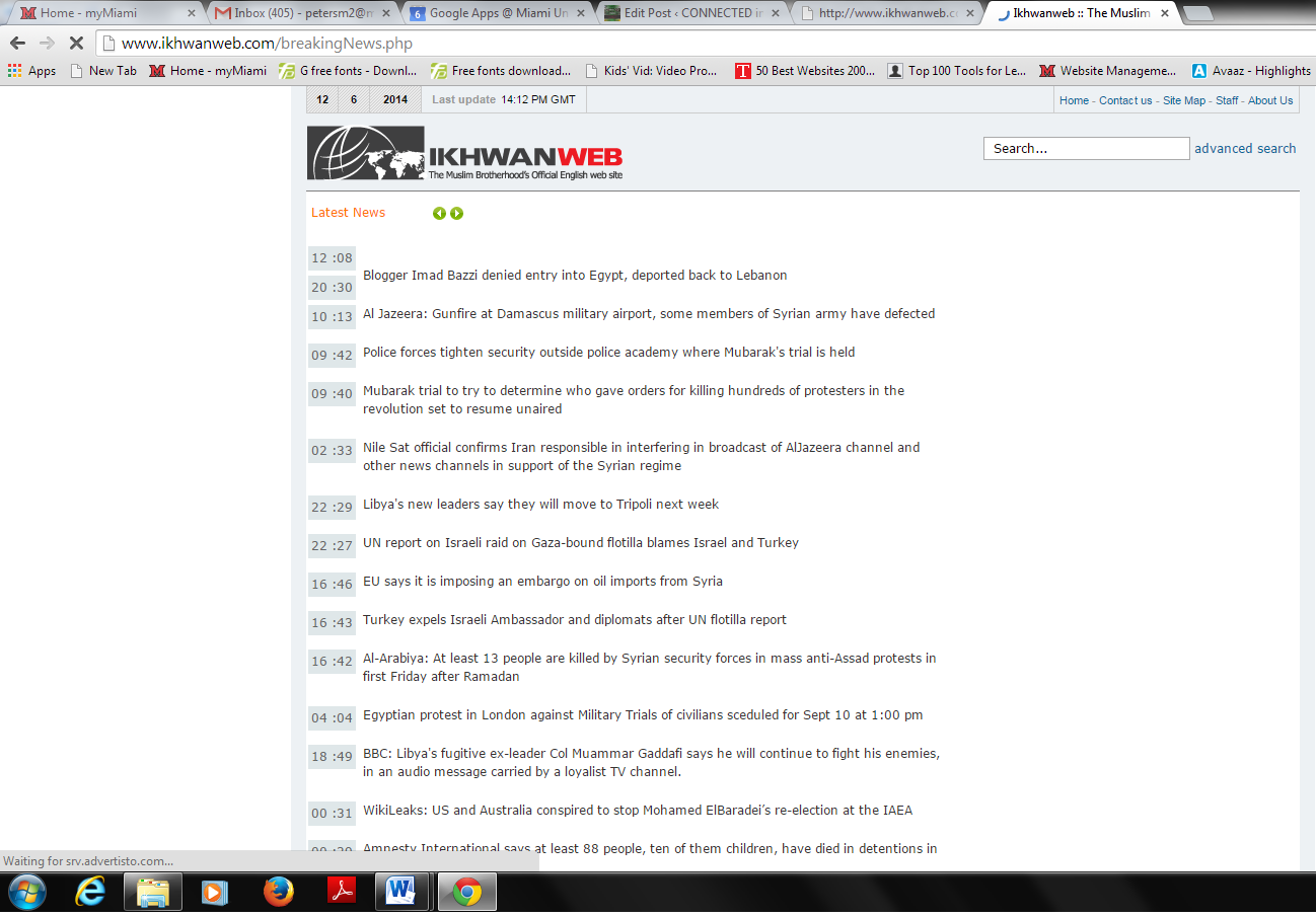 Bardhan’s analysis is an analysis of the rhetoric of Ikhwanweb during the last year’s of the Mubarak regime. Today, Ikhwanweb continues to interpellate Western readers through short, laconic postings of news briefs representing a world of ongoing struggle between Muslims and the authoritarian forces that continue to oppress them.