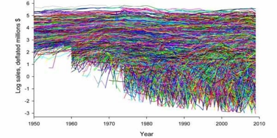 Sizes of some 30,000 companies traded publicly on US markets from 1950-2009, measured by their sales (controlling for inflation and GDP growth). The relatively rapid growth of smaller companies near the beginnings of their lifespans account for the ragged lower portion of the chart, as well as the relatively steep initial sales increases. As companies reach maturity, their sales tend to level off.